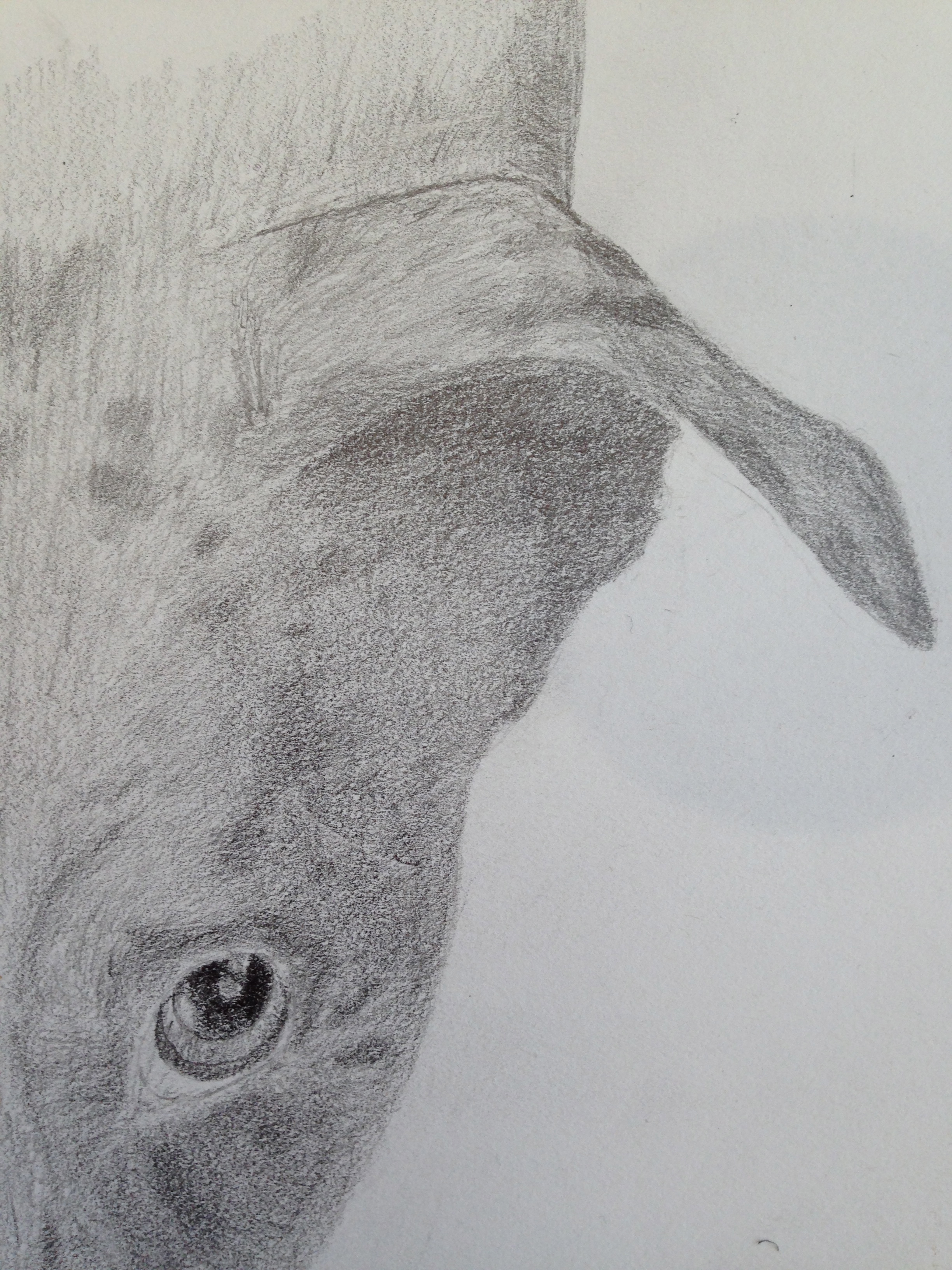 Actually getting close to finishing this one. Got coverage of the entire face except the nose. Worked on the values – focused on lighter values on the left side and darker shadows to the right. Not sure what to do with the nose, so going to hold off until my next lesson with Laurie in a few weeks. There must be some magic to get the unique texture of the nose, so that’s going to hold me back for the short term. Pretty happy with the rest of it, though. Included a couple of close ups for a better look.