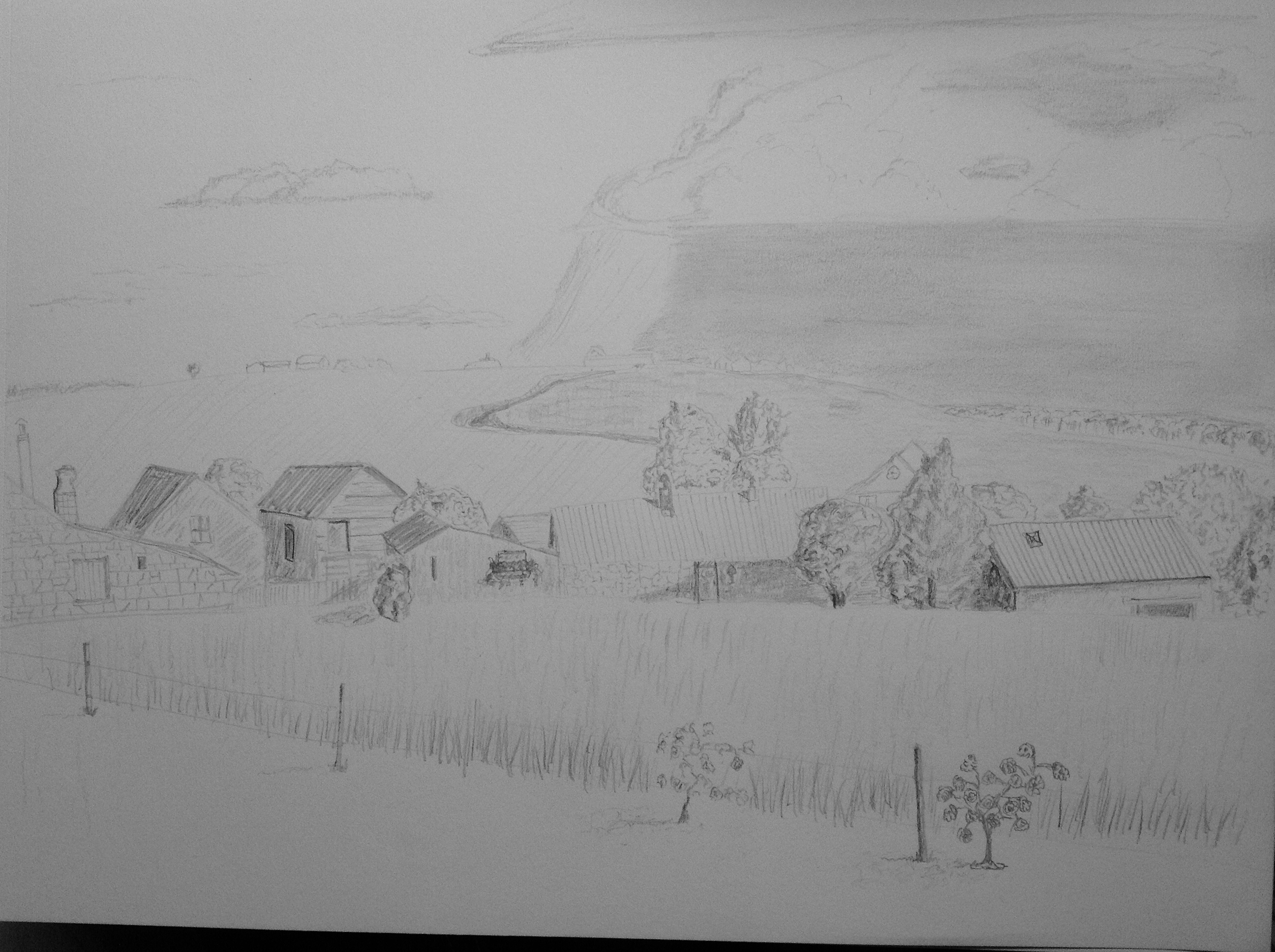 Today’s sketch inspired by my wife and our anniversary trip to the French countryside in the romantic Loire Valley region. The light was very strong from the right side of the sketch, so the shadows were very pronounced, as was the coming storm, which never materialized by the way. The rose bushes in the foreground are testers – not part of the actual reference photo, but rather a suggestion from my wife in hopes of adding some bright color to the soon-to-be painted version. Never sketched a rose bush before, but I think it’s a great addition to the sketch.