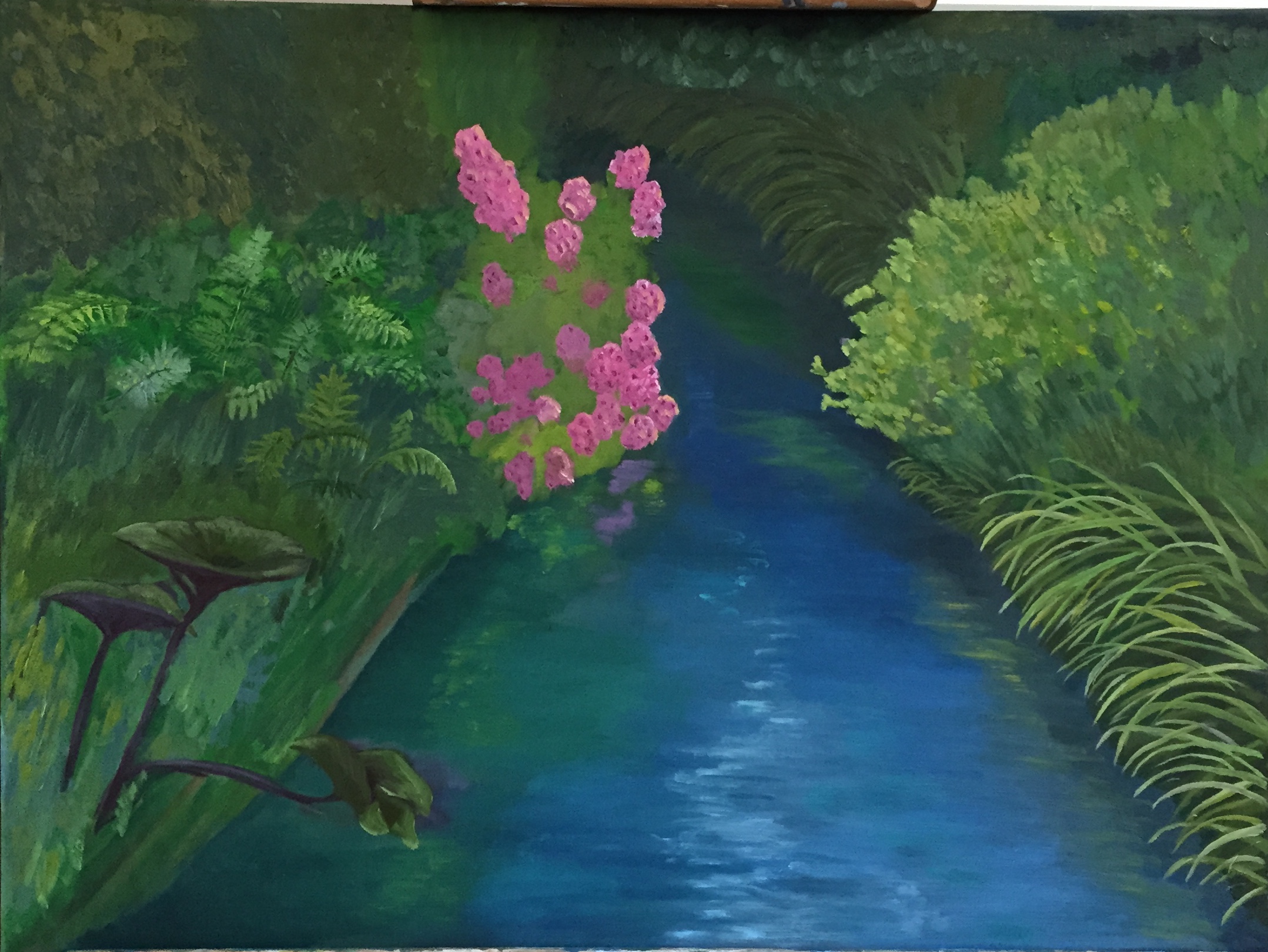 First, tried doing variations of blue water with white highlights, which didn’t look right. Roughed in the purple flowers in the lower left front corner.