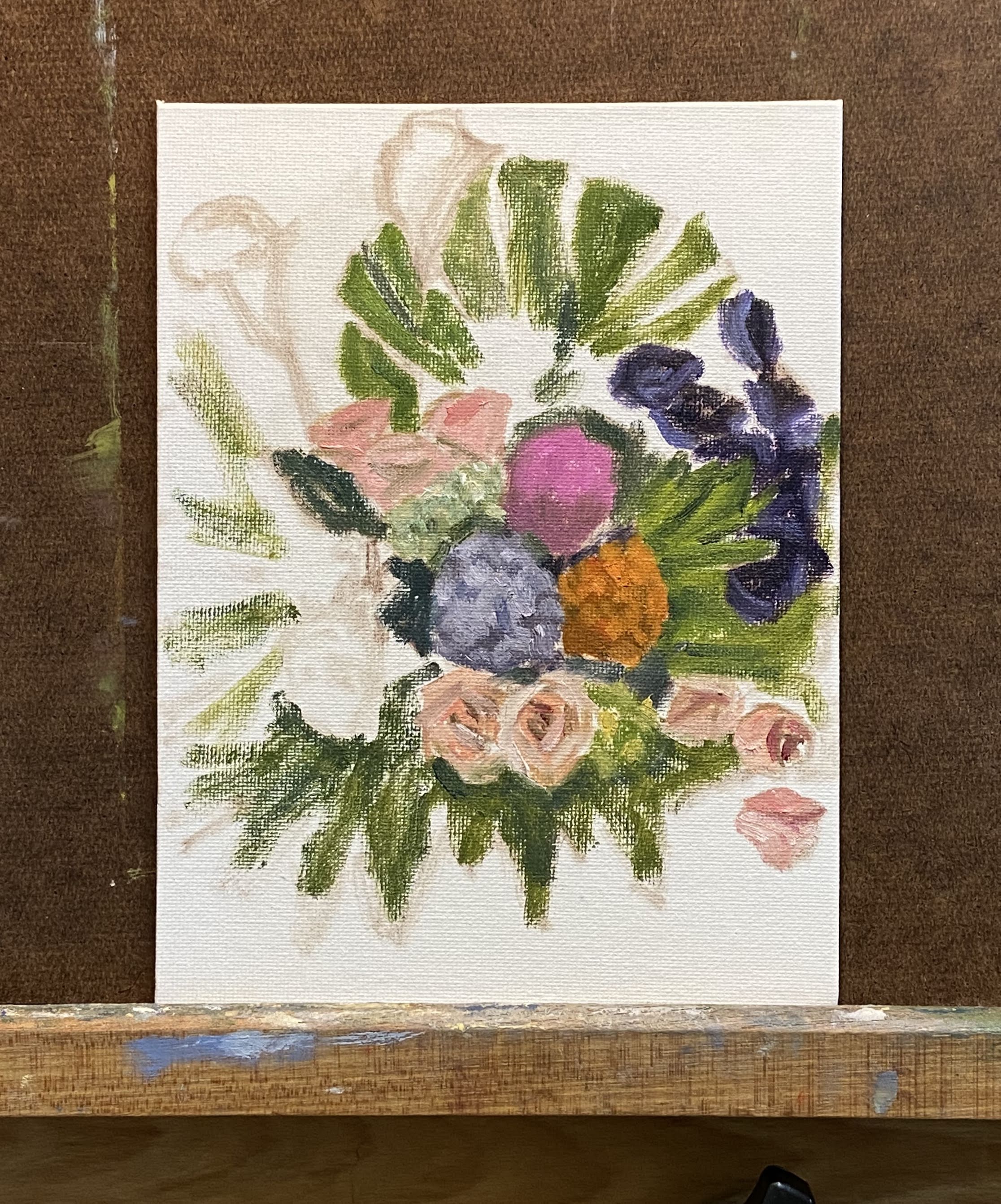 My last thought on this study is how would it change if I added a vase to the bottom of the painting. It would run off the edge of the canvas, but it would give some additional texture and context to the work. But I don’t think that’s the way to go because it would take away from the “explosion” feel the bouquet conveys in its current design.
