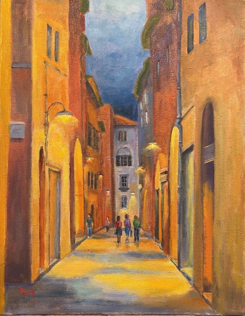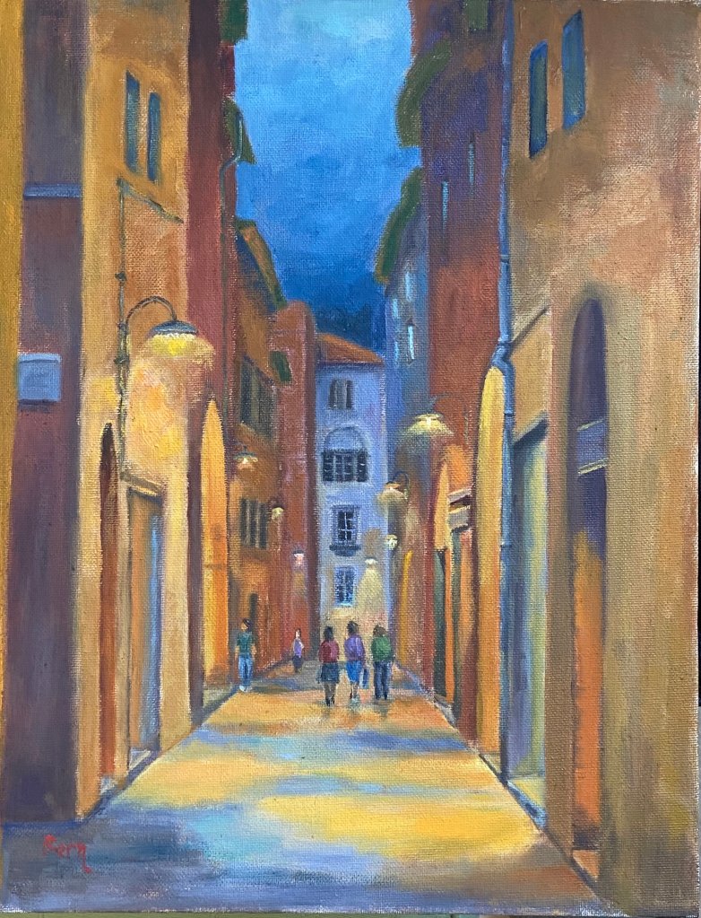 This particular scene is from a street in Lucca, Italy. The reference photo is earlier in the evening, just when the street lights go on, but I pushed the timing back a few hours so the lighting was more prominent. And just like magic, it was apperitivo time – break out the Aperol and snacks! If you don’t know what I’m talking about, rather than stumble through an explanation, just Google it yourself and promise yourself that one day you’ll go experience it first hand. Now back to the art…