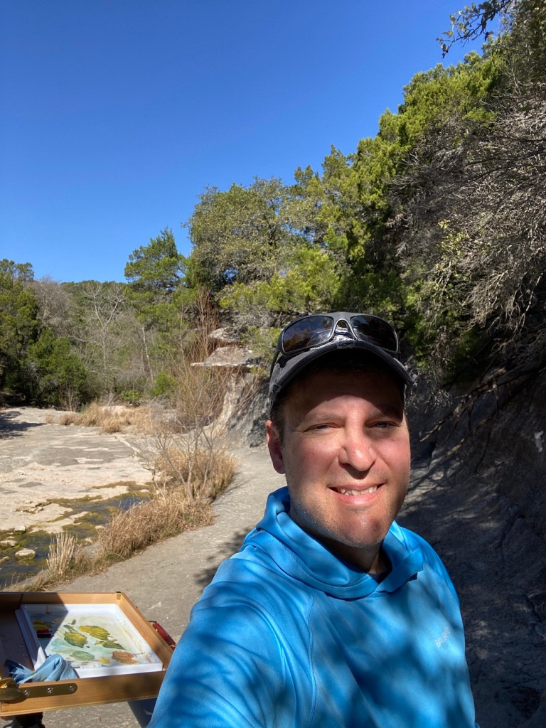 Taking in more of the great Spring weather, I headed out to do some more plein air. This session was at a place called Mirror Pond in Austin, very close to Lady Bird Lake and part of the Zilker Nature Preserve, which was the first nature preserve created in Austin back in 1935 (learn more at AustinTexas.gov). No dogs allowed, so my canine assistant, Zip, could not join me today to keep the pesky squirrels away.
