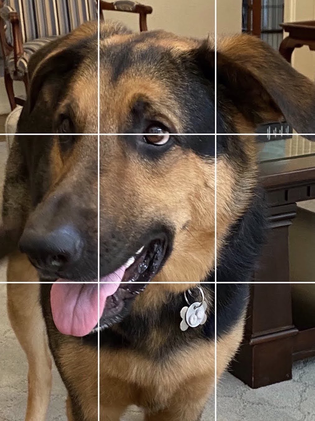 Despite the challenges, I had a lot of fun with this composition. And although it was a slap down learning experience, I did educate myself alot about what works and what doesn’t. Some of the “what works” highlights that will carry over into future pieces are the brushwork for long fur, the use of reds in brown haired dogs (it’s there, it’s just hard to see), and the realistic texture of a palette knife for the tongue and nose.
