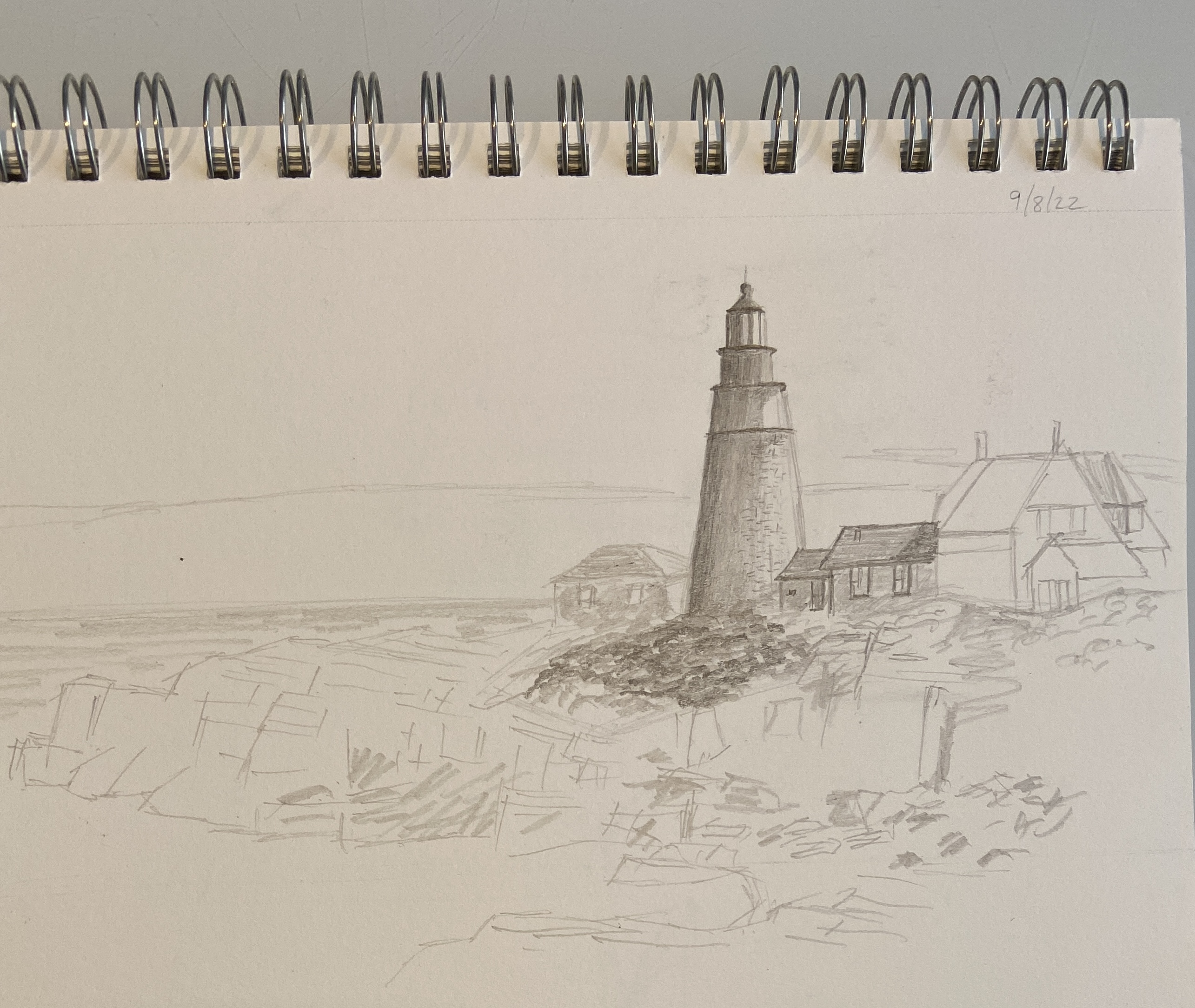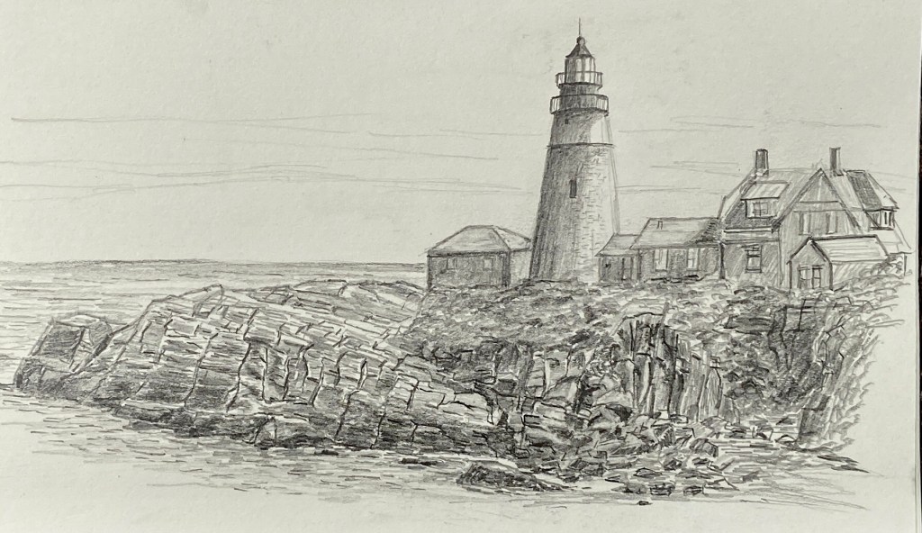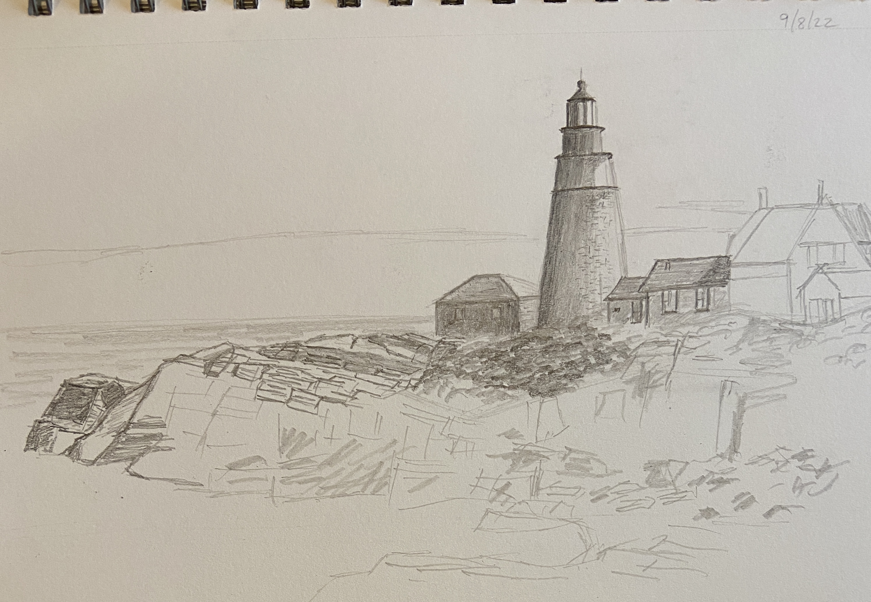 This started as a practice sketch to familiarize myself with this iconic Maine lighthouse in preparation for some plein air sessions. But it sucked me in and turned into a full blown composition. It still needs small tweaks and refinements, but that will have to wait because I don’t have all of my drawing supplies on hand.