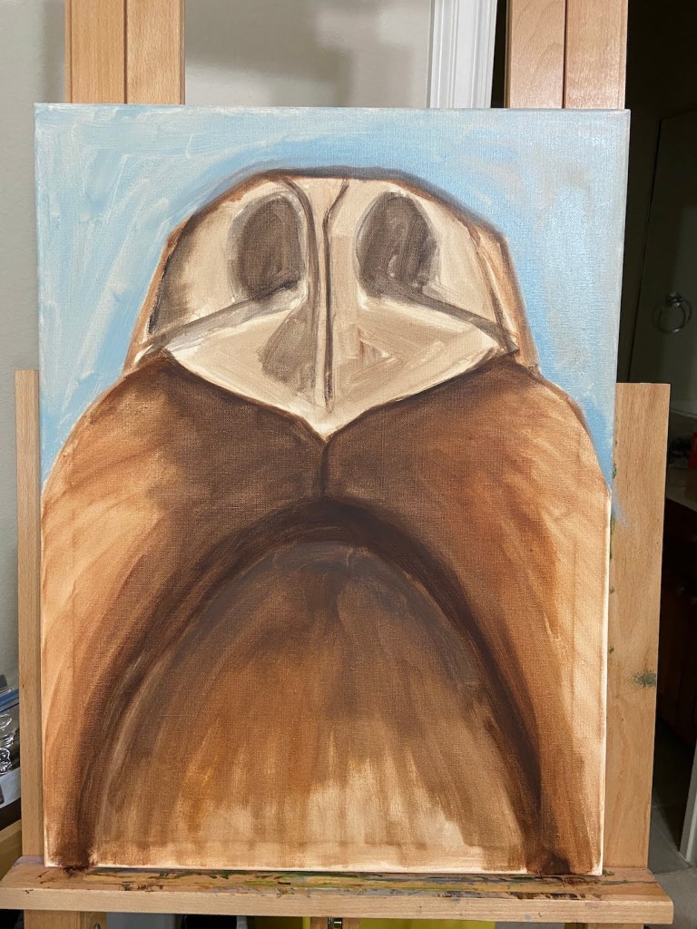 The first notable benefit of the repeat performance was speed. I didn’t have to spend much time thinking through an approach, and the setup / block-in went very fast. The other time efficiency was in mixing paint colors properly on the first effort without much, if any, experimentation. This is where having a painting journal comes in handy, as I’d made notes of color mixtures for SNIFFER and only had to make some minor tweaks for the new piece.