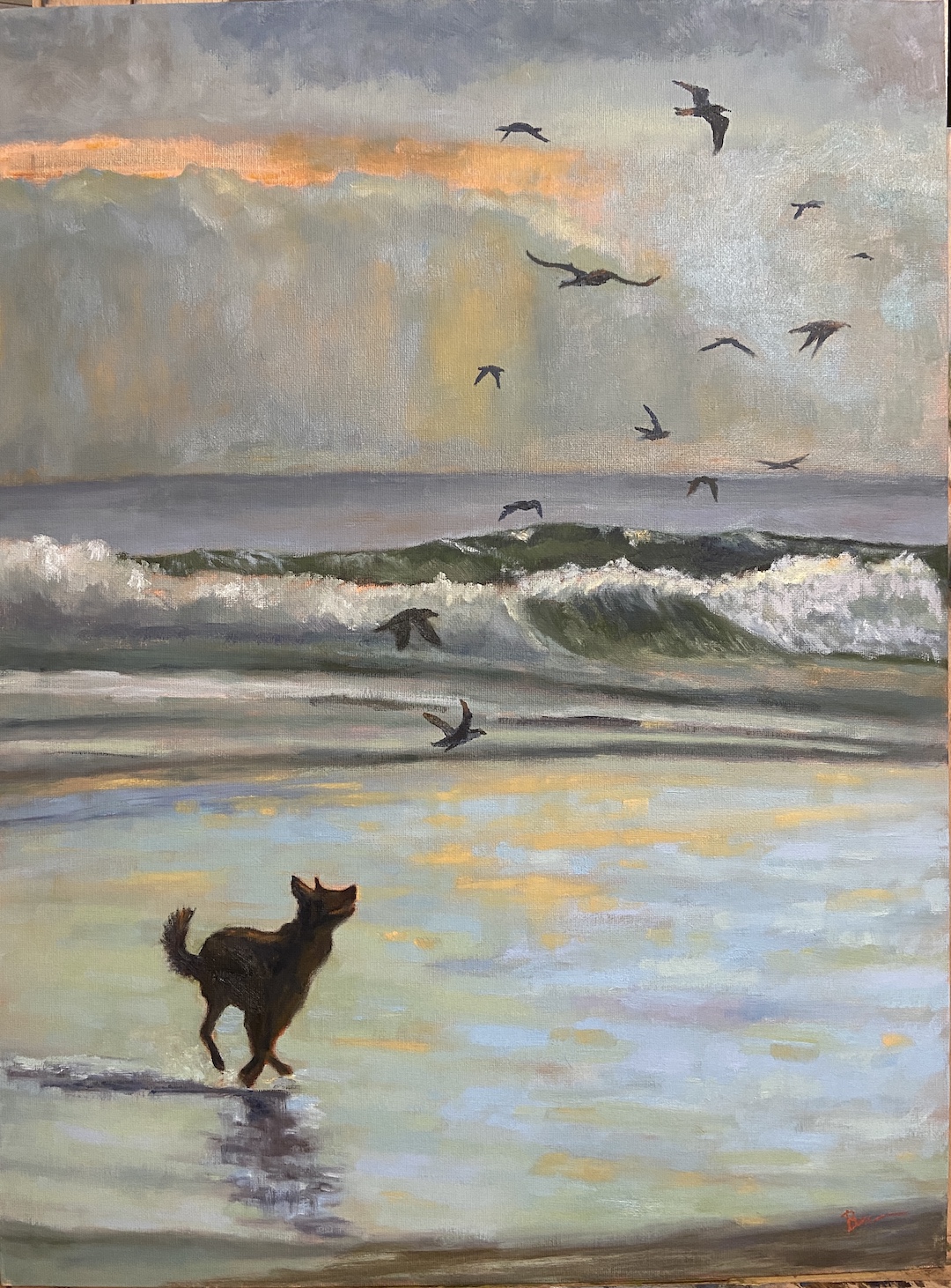 2. Interesting decision about decreasing the number of birds. The end result certainly works. I did have a thought about this — when i was last in Oregon on a beach which featured both a dog chasing birds and a large flock of birds: probably 30 or so — a painting with that many birds would have worked well, but i think it was because the birds were small ones so the group flying together looked quite benign.