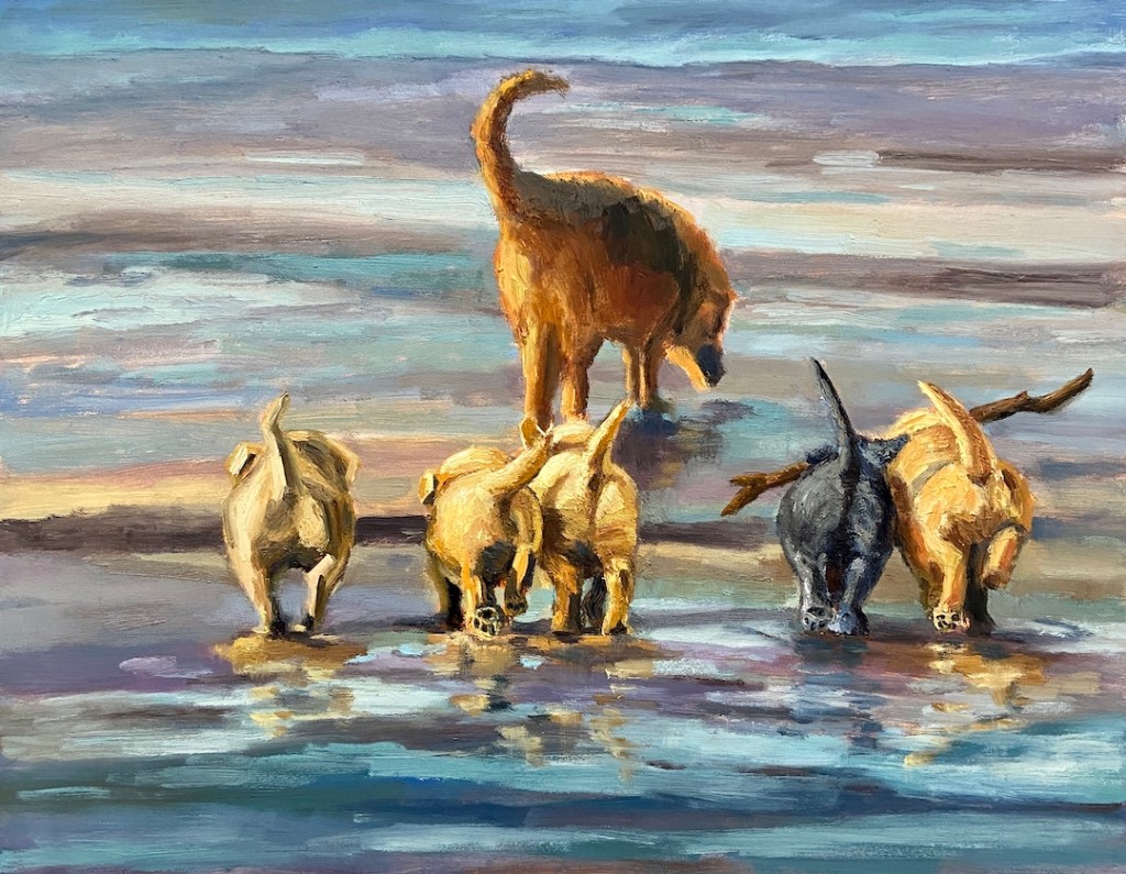 This is such a fun and creative painting – I love the stick in the background and the puppies playing with it!