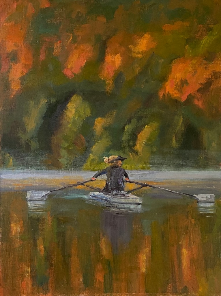 This is intended to be a study, as I anticipate making a go of this on a larger scale. I love the colors and the serene nature of the composition, despite knowing the rower must be exhausted. Or about to be. I struggled a little with putting the rower in the center of the canvas, so I made sure the horizontal positioning was dropped to the bottom 1/3rd. I tried to use other compositional elements to ensure the piece was balanced, namely the oar bars pointing into the rower, and the color sandwich effect of the orange from the trees on shore and reflected in the water. Lastly, the subtle glance of the rower to the right gives some additional interest in terms of what’s happening just out of sight. Like I said, it’s one hell of a reference photo!