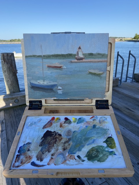 As to this painting, I had already decided this was going to be a 50/50 job, namely half outside, half in studio. The goal was to lay down a solid structure and really balance the massive blue expanse of the sky and sea with the focal points of the boats. The lighthouse should give perspective and some added interest to the piece, but the intent to so give the sense of place sitting on the water watching the day go by. For me, this is still very difficult because virtually all sailboats are dominated by white, either the sails or the top deck, so the brush strokes have to be very intentional and the values need to shift much stronger than what I see “live”, at least that’s how I think it should be done.