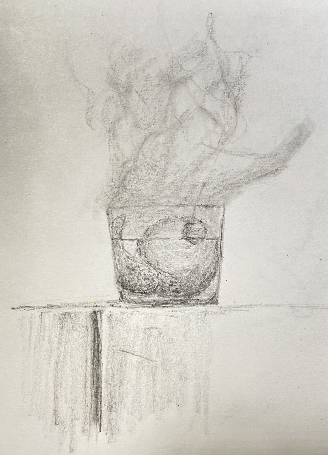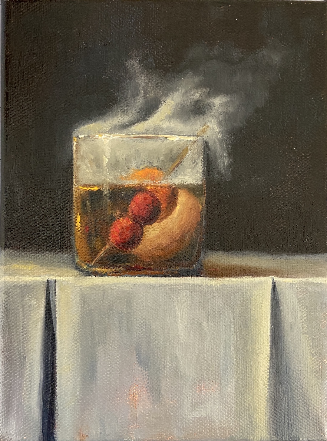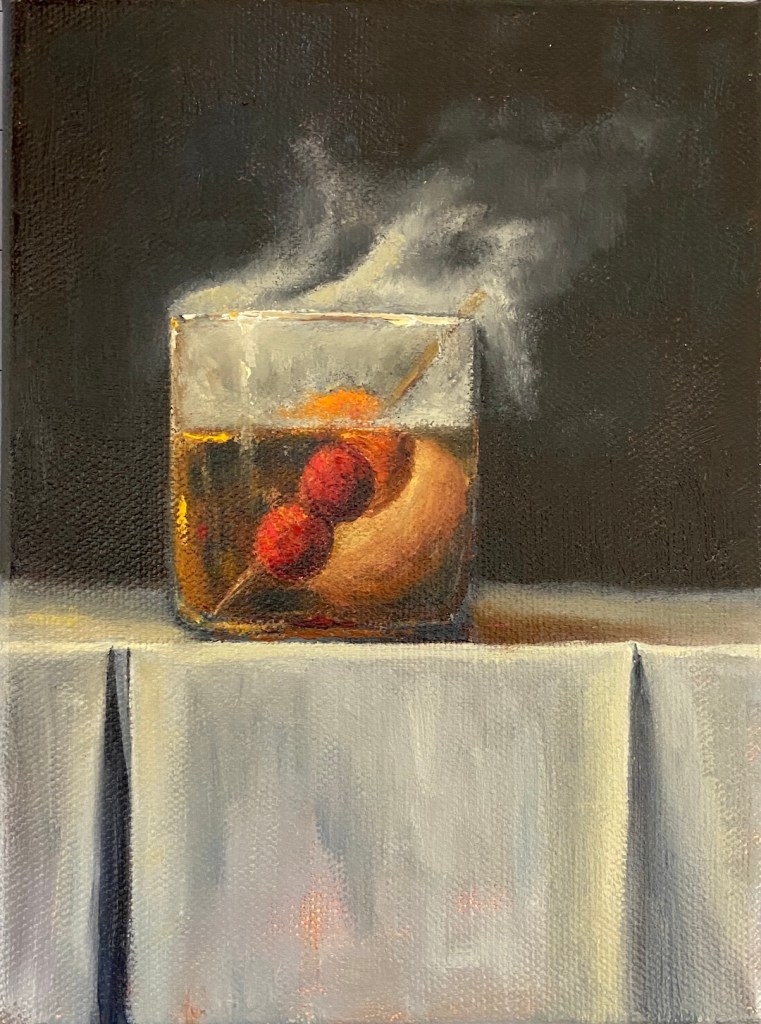 The trick with this piece was clearly… smoke! But before getting to that challenge, there was the issue of compositional tension. Technically, an Old Fashioned isn’t so much a cocktail as an origins story of composition. The Meehan’s Bartending Guide, my personal true North for all things cocktail, notes “the cocktail was first defined on May 6, 1806, in The Balance and Columbian Repository as ‘a stimulating liquor, composed of spirits of any kind, sugar, water and bitters’. By the time it showed up in a professional bar manual for the first time in Theodore Proulx’s 1888 The Bartender’s Manual, it was already “old-fashioned”.” My personal preference is rye whiskey, simple syrup, bitters, 1 cherry and an orange twist. Now back to the painting…