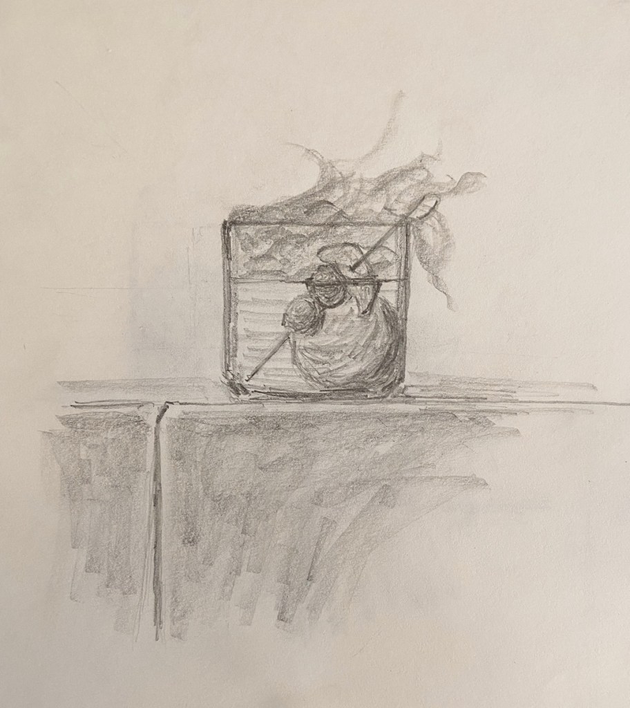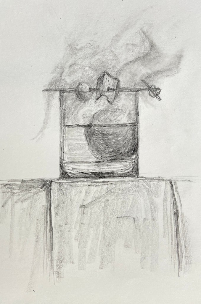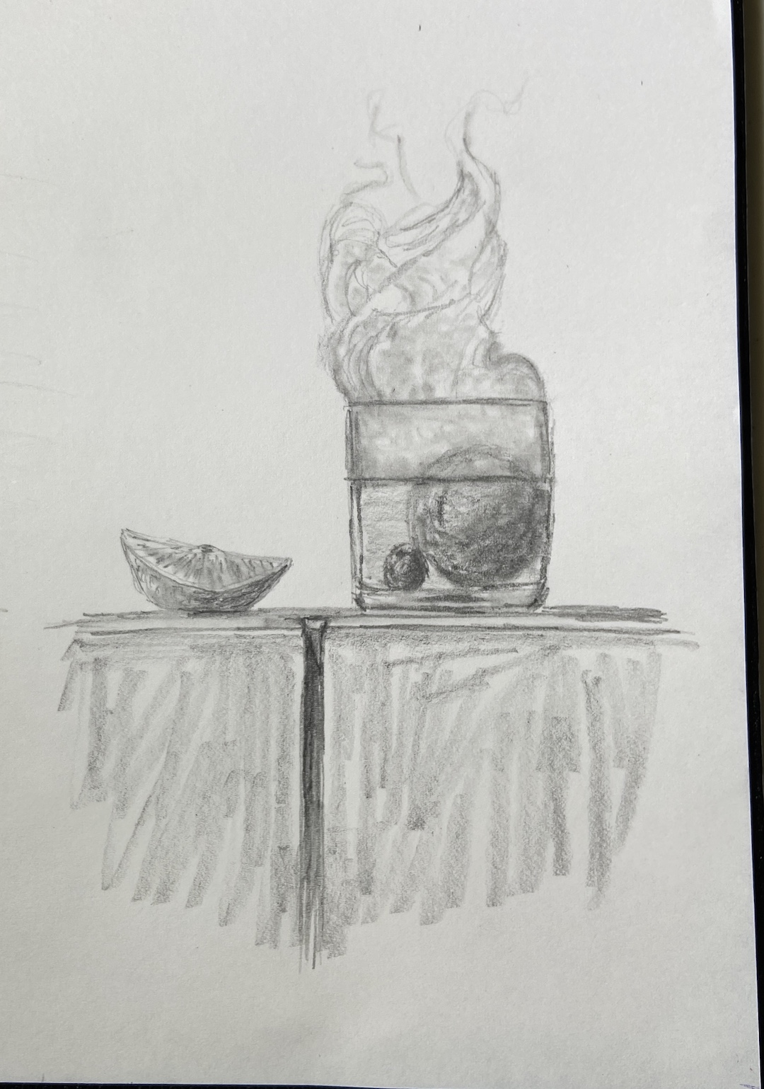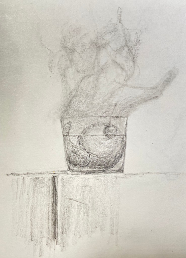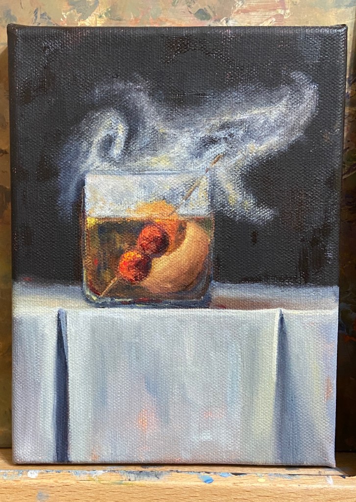 I’ve painted a number of libation-based still life compositions, but nothing with smoke. It required me to investigate if painting smoke was similar to creating fog, mist, or larger fire-based plumes.
