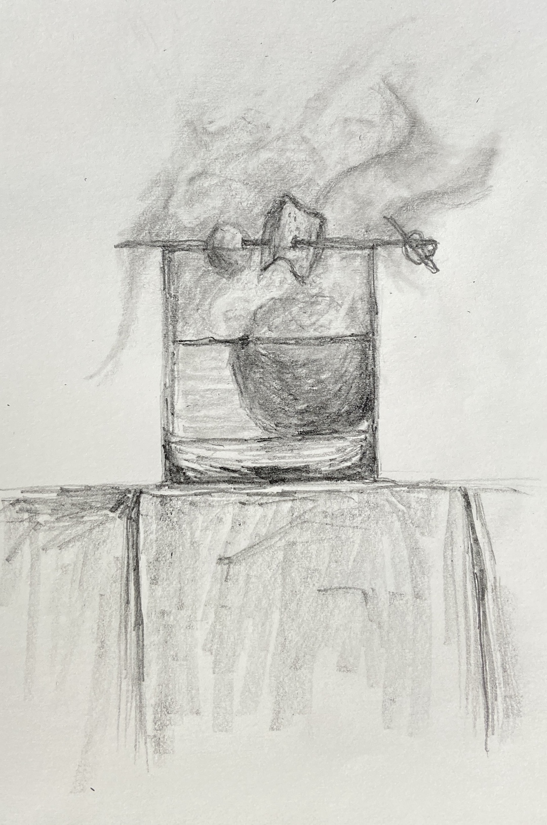 The request for this piece was to incorporate Luxardo cherries, orange peel, and a large round ice cube. Figuring out how best to structure this as a piece of art was trickier than I thought, even without the smoke. Once you put all that stuff into a lowball glass, it’s impossible to not notice the tension of so many things jammed into a small space. To tackle this problem we simply talked through various sketches that presented different solutions, and we ultimately landed on cherries on a toothpick, angled into the glass, orange peel also on the toothpick but above the whiskey line, and lastly a demotion of the round ice to the background. As a pleasant surprise, once the smoke was added, it significantly improved the compositional structure because it broadened the view and seems to have further reduced the tension, essentially granting the viewer a larger viewing room.