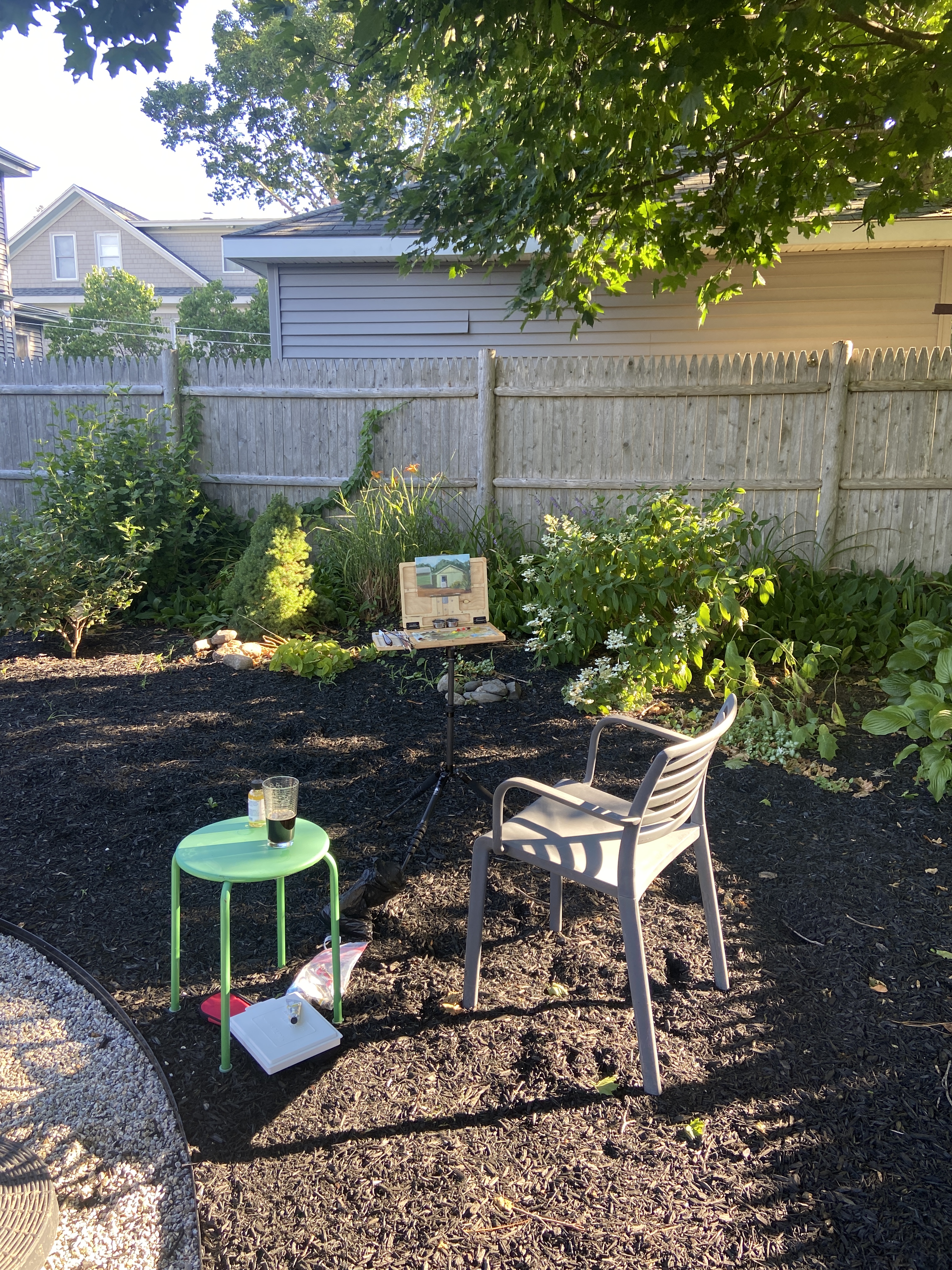 This garage was painted over the course of 3 short sessions in the mid/late afternoon. The shadows created by the sun really make the garage door pop, so I wanted make that the clear focal point without making the white to prominent. The final solution was to tweak it so the black window of the door was the primary focus, using the high contrast in values with the white door as an easy viewing vortex.