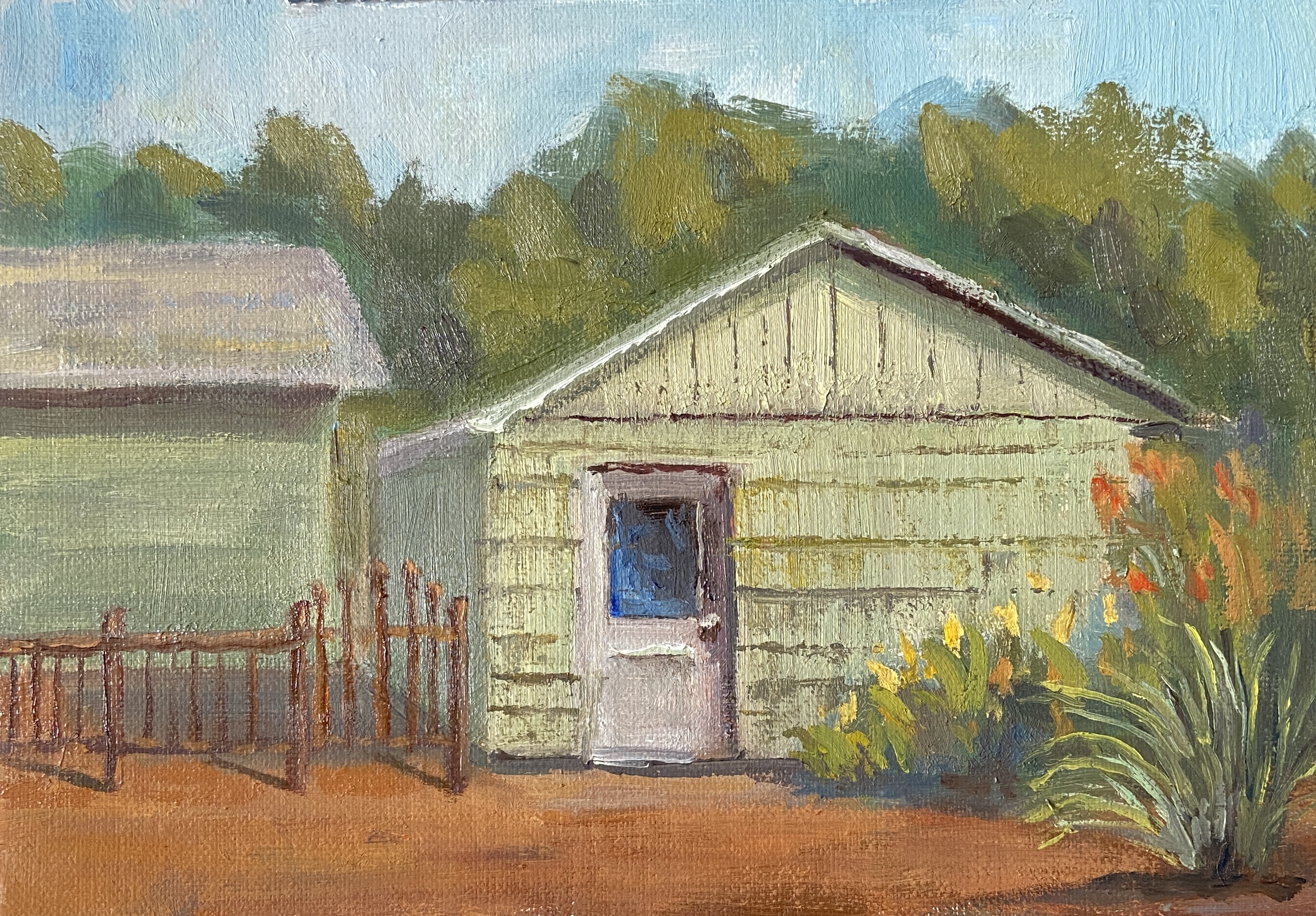 Lastly, I made a decision in the final minutes of painting, after having thought I was done, which significantly improved the finished piece. Because I don’t have a before and after shot, I can only describe what I did, which was to add the high contrast “rows” on the garage, then scraping down to give the sense of textured panels. I was pretty sure the move was going to muddle the whole thing, but as it turns out it was a vast improvement. I must learn to be much aggressive when painting and this sessions went a long way in validating that approach.
