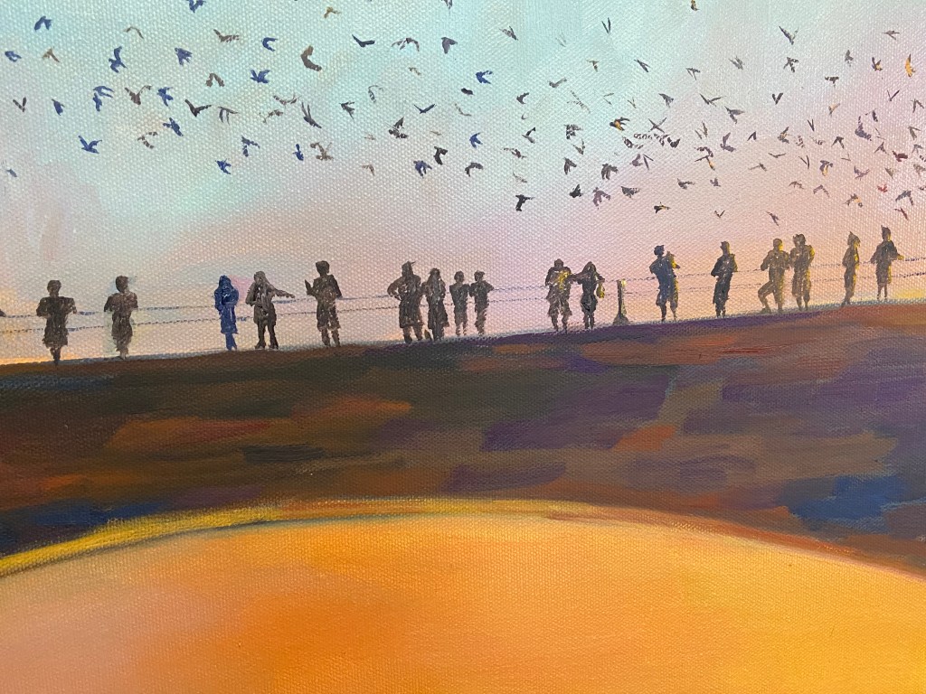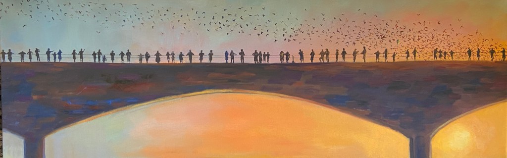 This piece is inspired by the bat colony under the Congress bridge in Austin, Texas, but note they are not the focal point. The 56 silhouettes along the bridge are the intended focal point, which as a group, show the evening observations of the bats on a summer evening. However, as you look at each individual person, you can see how their experience is unique. Hopefully you, as the observer, have some emotional response to some of these folks.