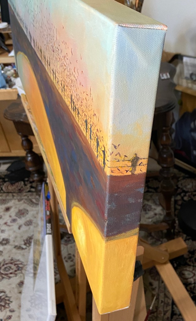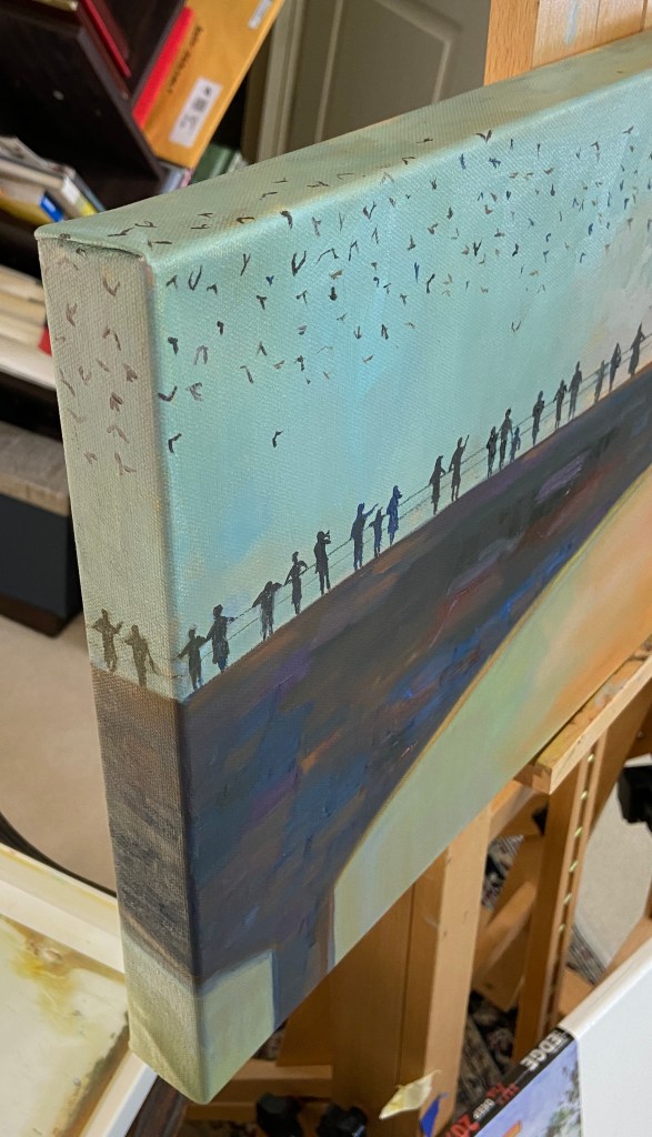 Another element of the composition is the use of the 1.5” edge of the canvas, allowing the bats and silhouettes to flow around the frame. The figures on each side are looking into the painting, which should help direct observers into the composition.