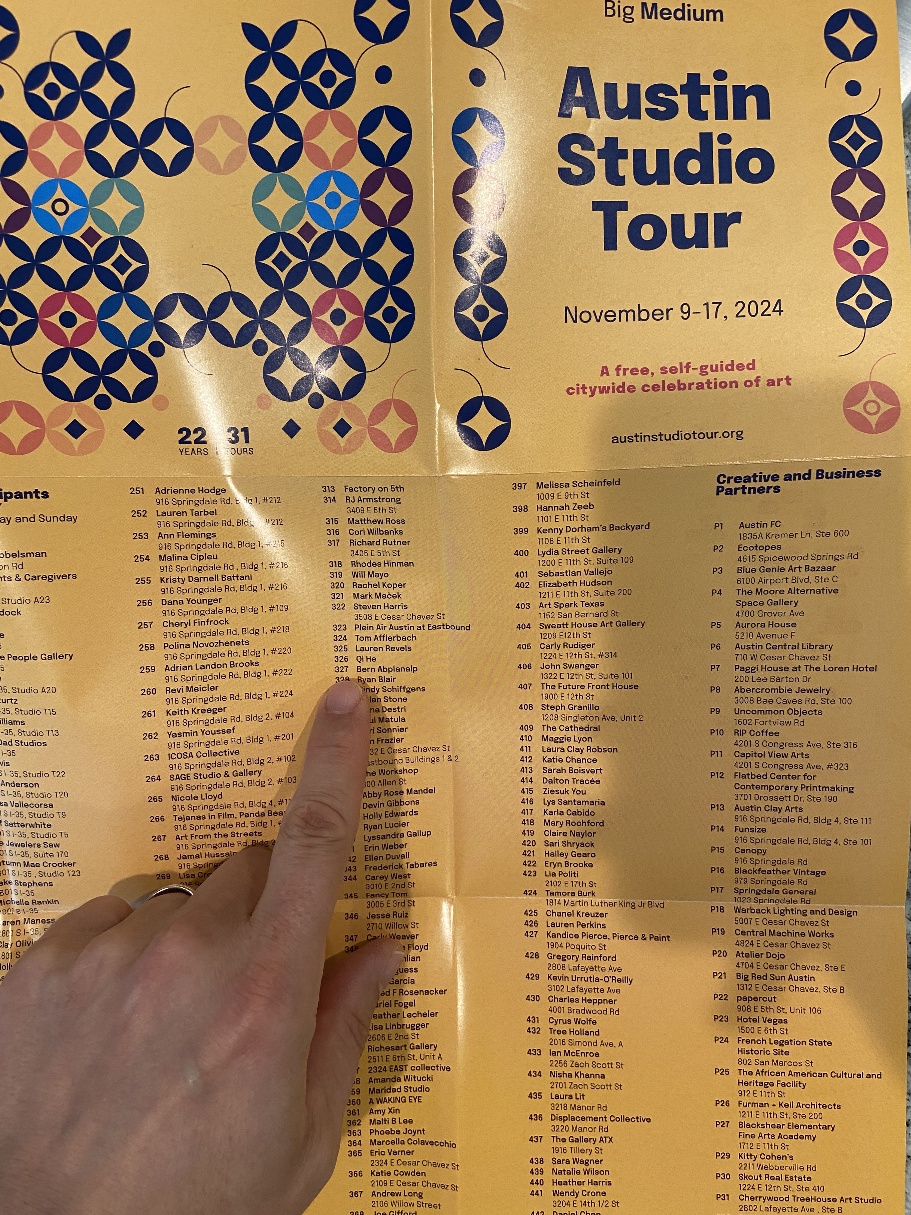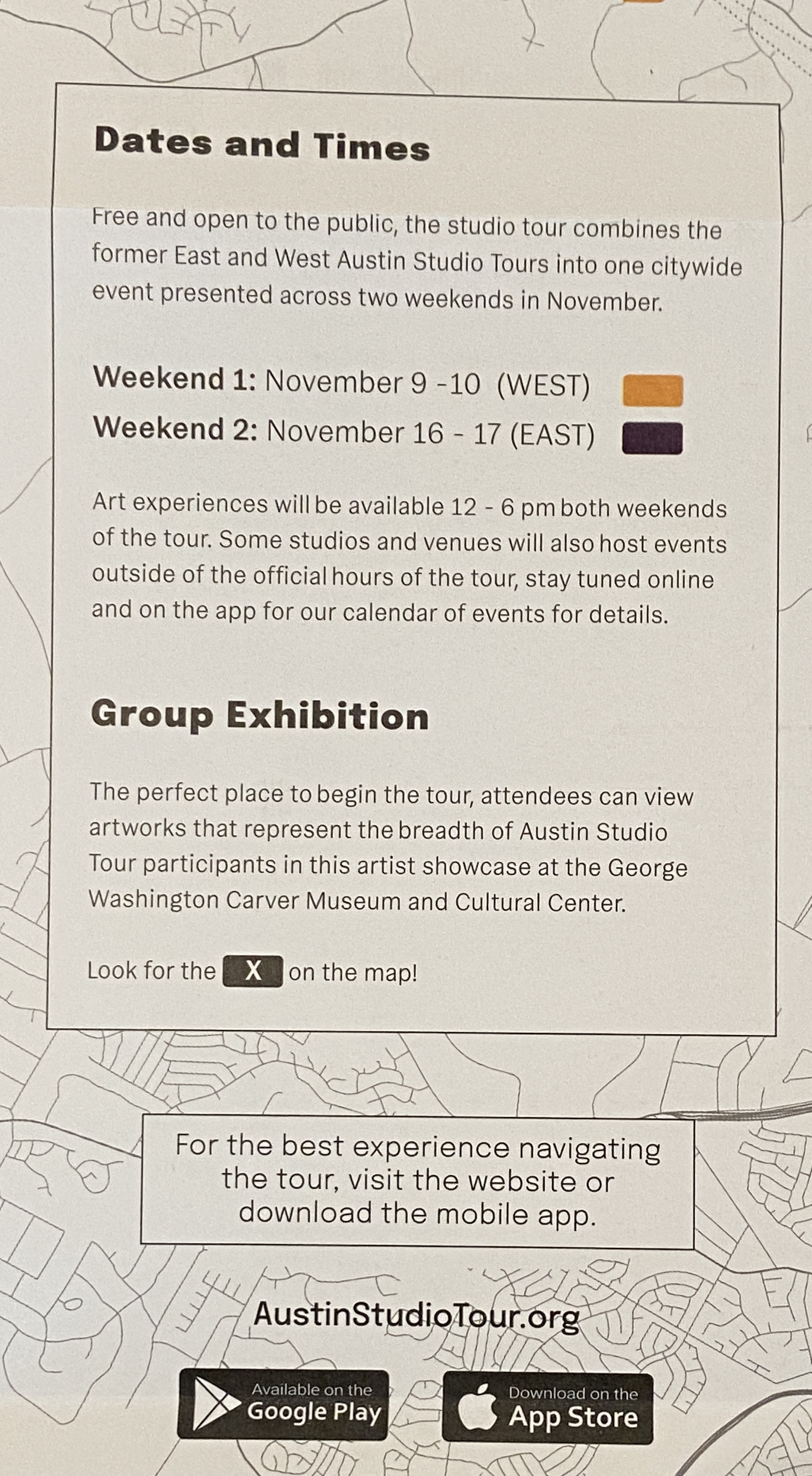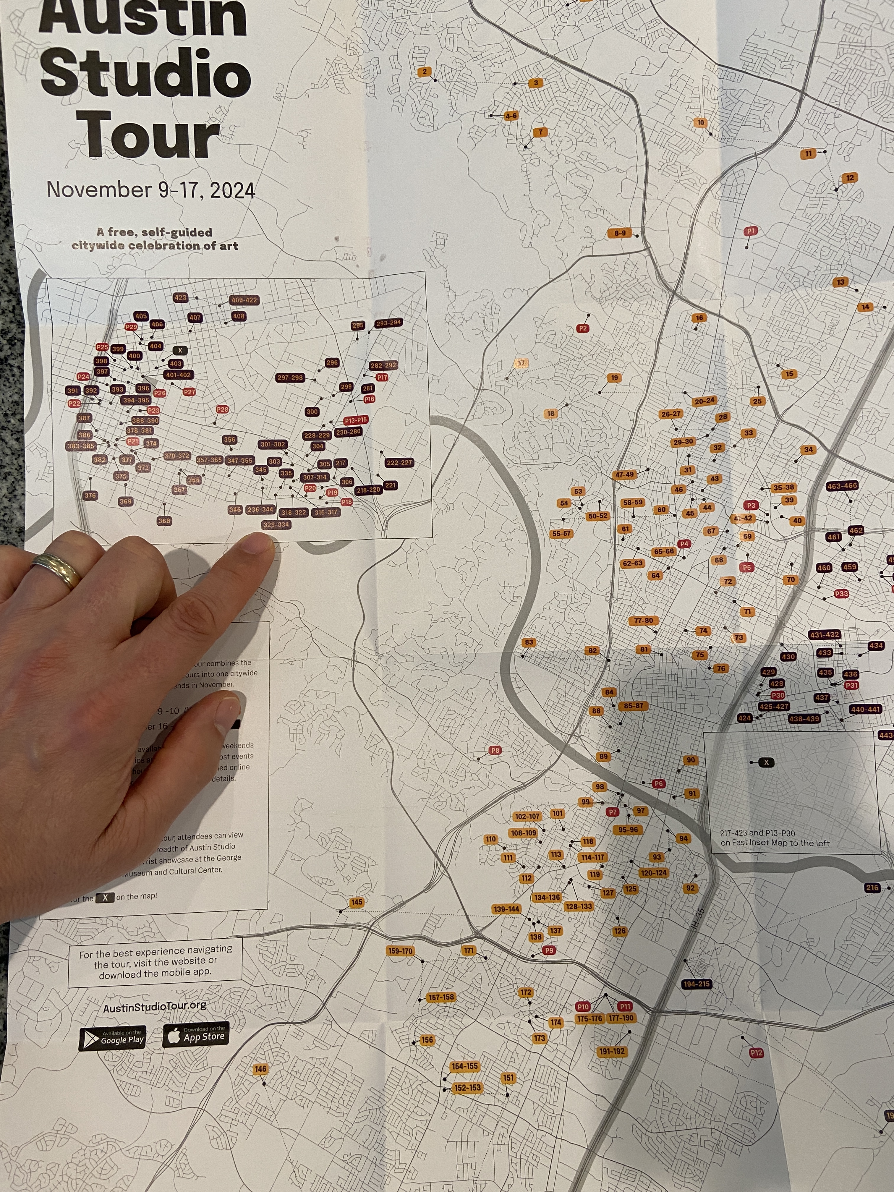 The Austin Studio Tour, in a nutshell: over the course of two weekends, more than 400 artists open up their studios or display in public spaces/galleries… for FREE! The city is basically split into East and West sides (I35 being the demarcation), whereby weekend 1 is “WEST” studio tour, and weekend 2 is what I like to call the OG “EAST” studio tour.