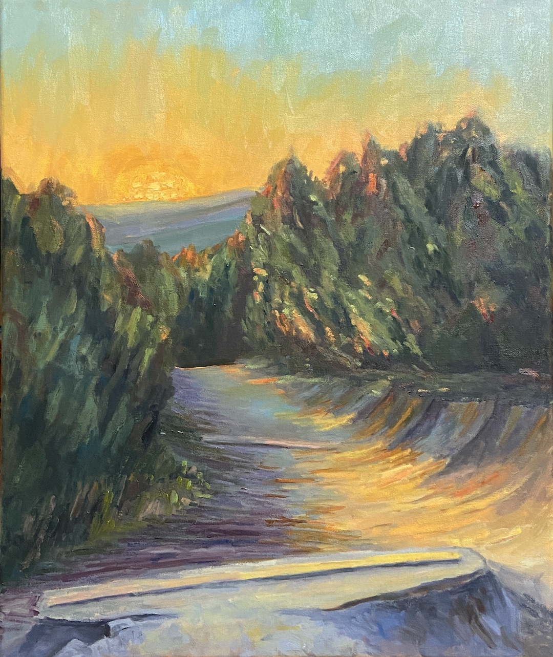 The obvious focal point is the huge setting sun, but I also consider the darkest section, namely the last ledge down the trail, as a main hook for the viewer. The odd looking concrete bar at the base of the painting is one of the aforementioned joints in the original road, which makes a little more sense when you look at the painting and reference photo side-by-side. I spent considerable time ensuring this was more realistic than impressionistic to garner interest in the piece, hopefully without causing confusion for those who haven’t been to the Hill of Life.