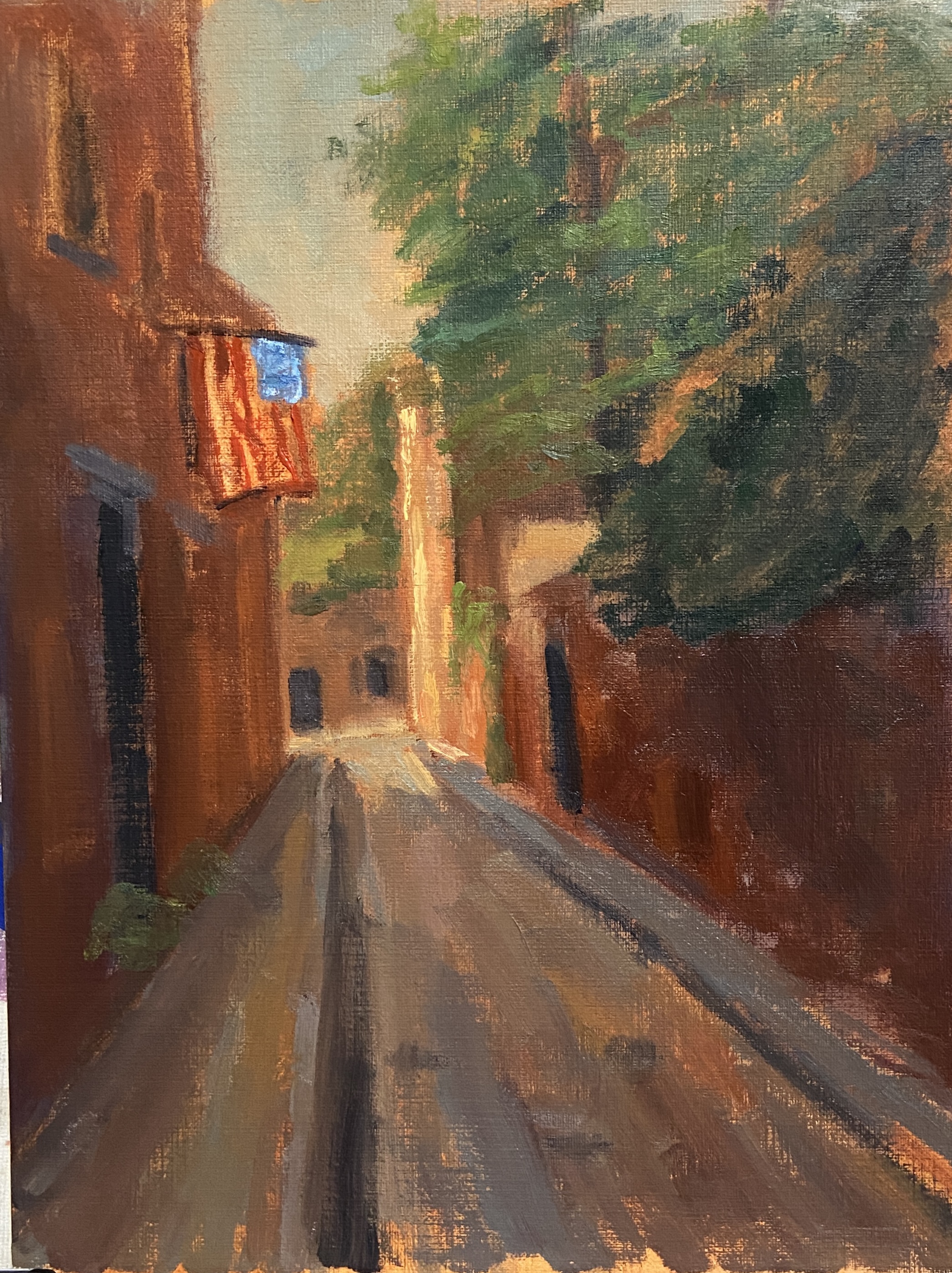- Screen Windows: There is a real nuance to getting this right, and something I’d never tackled before. I’ll be honest, luck had more to do with the final result than anything – my artistic creativity isn’t the best of friends with architectural features of the world. If you look closely at the screened-in patio, you’ll notice the most prominent part is in the sunlight, and that area is nothing more than the original underpainting of burnt sienna. The very thick, toothy nature of the canvas board also contributed ideally to the aesthetic without much need for artistic technique. That said, I’ll remember this bit of serendipity the next time I run into a screened porch.
