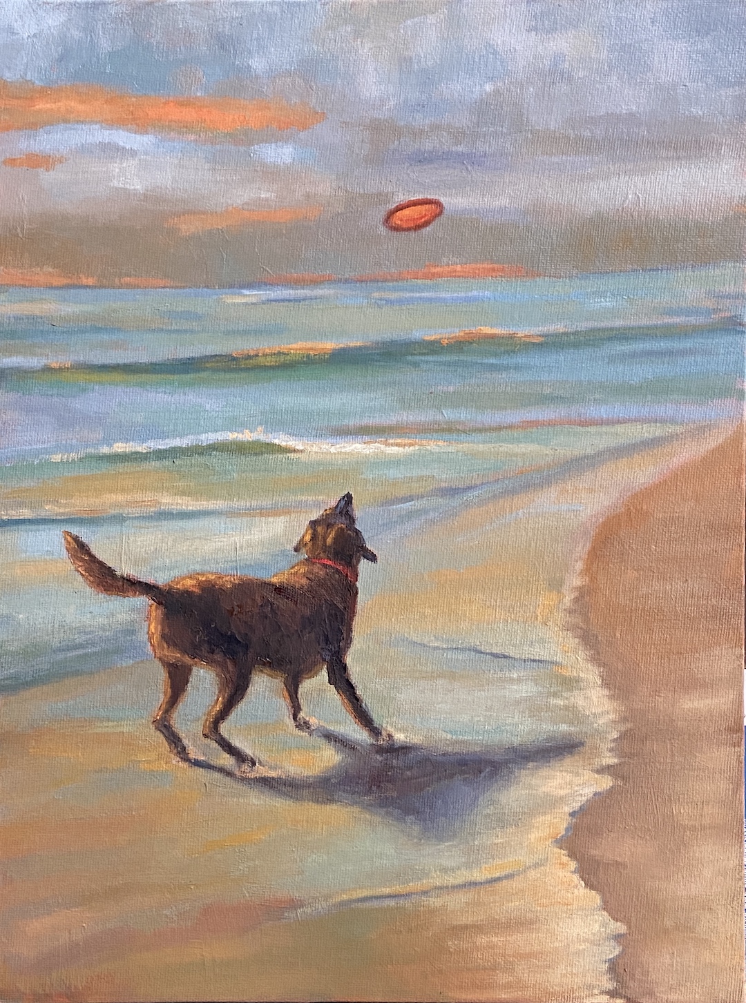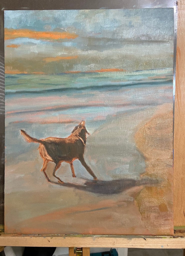 The biggest challenge, as expected, was Vedder. Getting the shape right, and I hope it is (you’d have to ask Jason and Alicia), wasn’t too bad, but trying to get the black hair to pop on the canvas and work the reflection of the sun on his coat, well that took some experimentation. Ultimately it came down to the magic of alternating warm and cool blues. I also incorporated a lot of knife work so there was some texture to his coat, as well as some fine brush work on the edges so he looked wet. When I asked Alicia what Vedder likes to do at the beach, thinking I could incorporate a ball, stick or frisbee into the artwork, she said “he just likes to run around”, or something to that effect. He was simply a happy, energetic, loving dog!