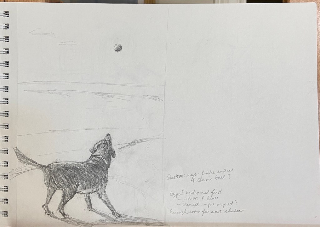 I’ll need to do a number of seascapes featuring beaches this year so I can capitalize on the lessons learned with sand. First, sand apparently comes in a wide range of colors, none of which you recognize until you try to paint said granules. I thought there was simply dry sand (light brown) and dark sand (dark brown). This is not the case. For the record, a beach full of sand has an infinite number of value and color gradations. Suffice to say it worked out, but I have a newfound appreciation for professional painters who incorporate footprints along the beach.