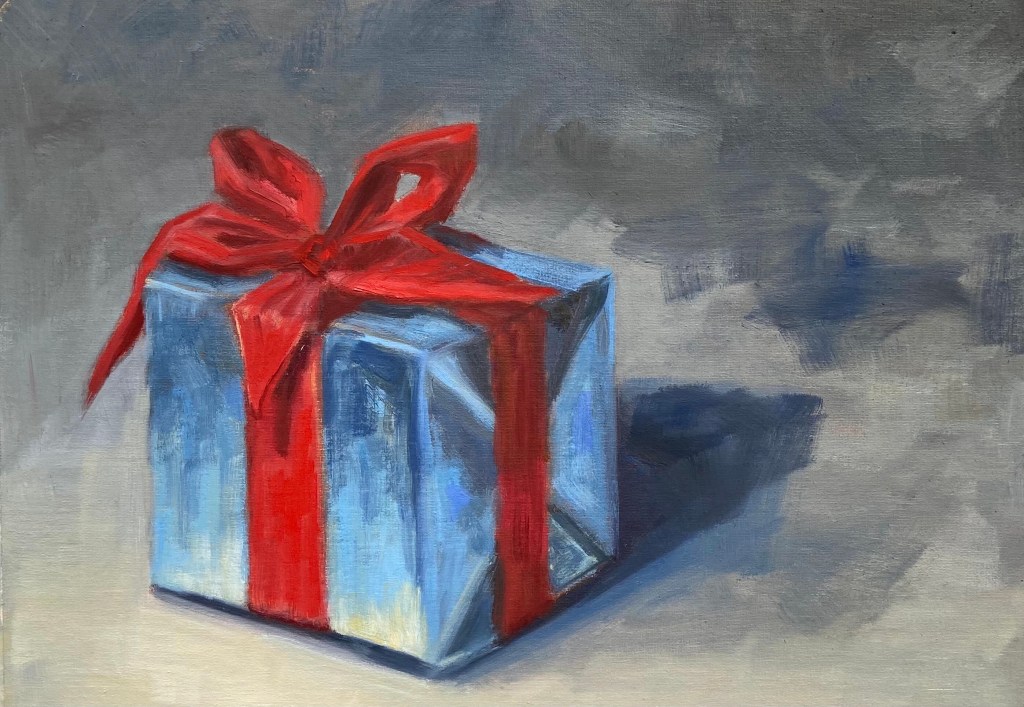 Blue Gift Red Bow | Oil on Canvas Paper | 12 x 9 | $30