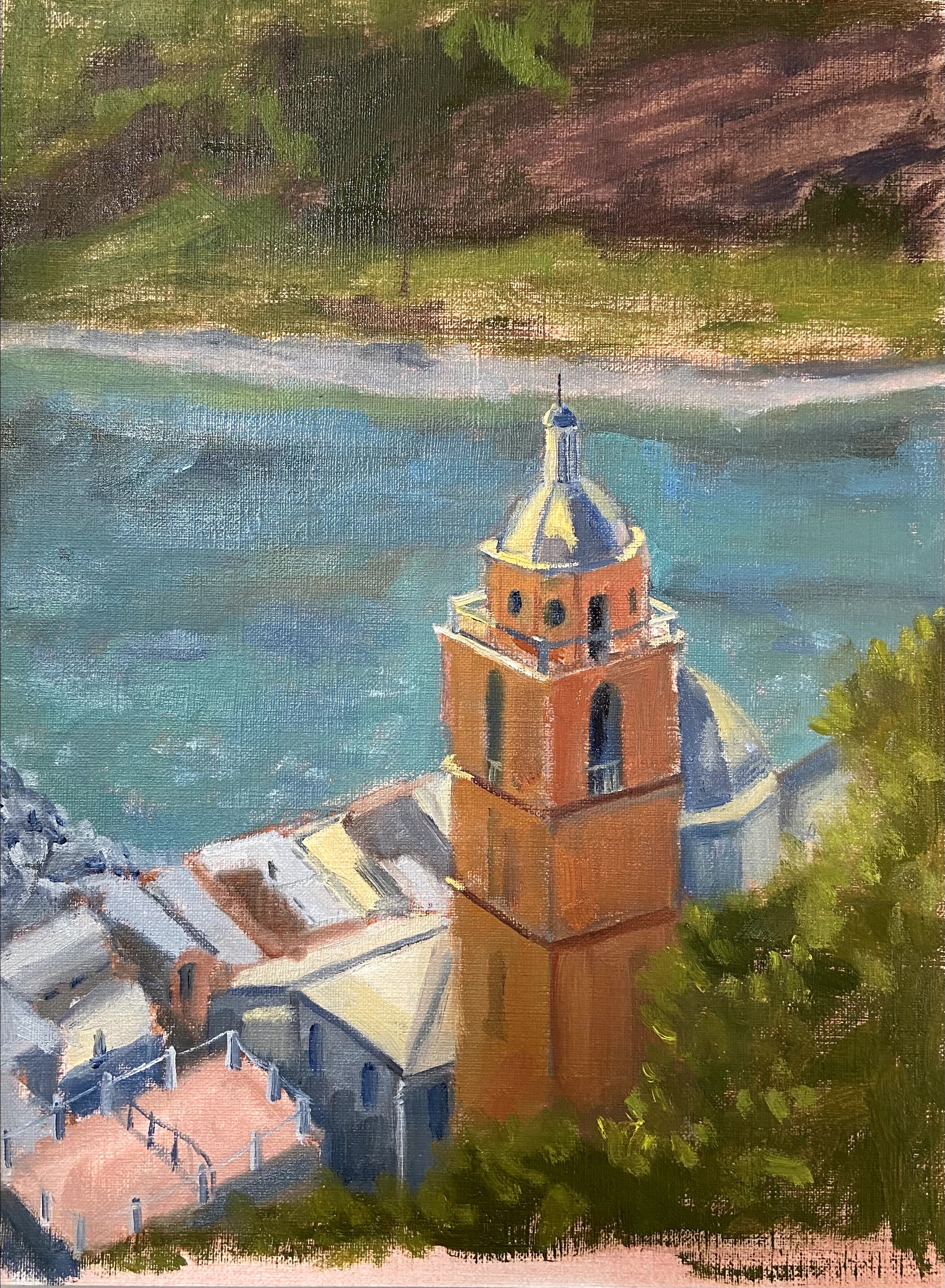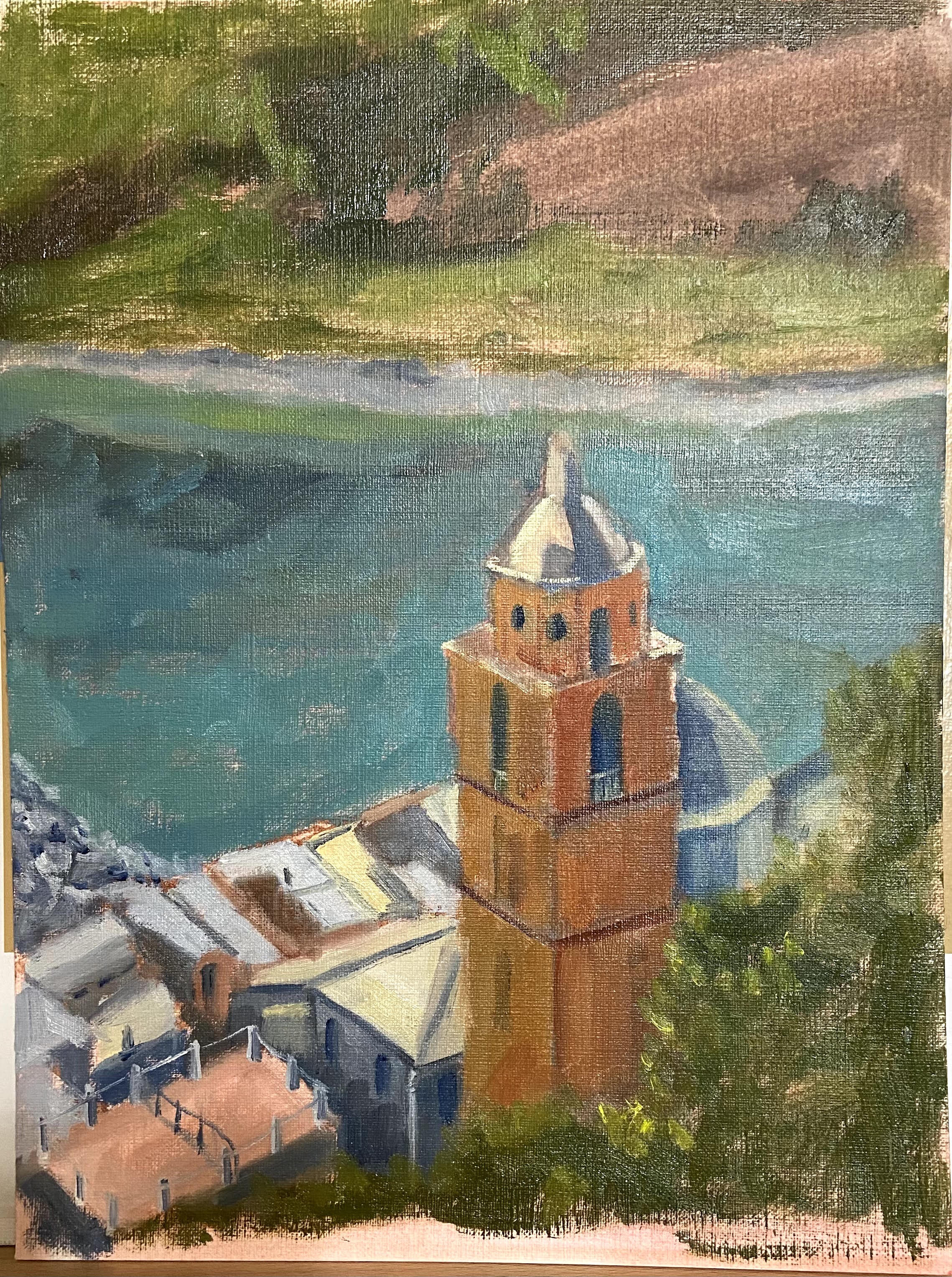This composition has been on my short list for awhile, so I’m very excited to have put brush to canvas finally. The subject matter is a photo I took from the hillside in Porto Venere, Italy. The power of the sun shining on the church tower with the beautiful blue water in the background was an ideal setup for this piece. It kinda painted itself.
