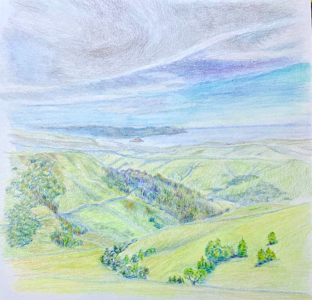 As to the greens, I focused on blending variations of blues in the more distant hills, segueing to stronger yellow in the foreground. I wasn’t excited about the final look initially, as it lacked warmth from the sun, so I drank some wine to work up some liquid courage to grab an orange/red pencil to add an overlay to the foreground hills. Unlike oil painting, you can’t just wipe off pencil – true, it can be erased, but then you’re compromising the “tooth” of the paper, and at some point I hope to be good enough that something like that matters.